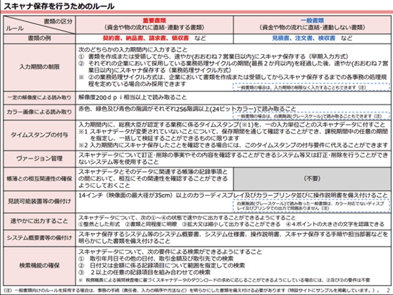 一般書類は白黒保存も許されていますが、重要書類は原則カラー保存が義務付けられています。また、入力期間の制限もあり、早期入力方式で7営業日以内、業務処理サイクル方式は最長約2ヶ月以内と定められています。